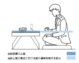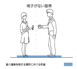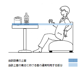 | 法第2条第1項第1号から第3号に掲げる営業 | 1 客席に食卓その他の飲食物を置く設備がある営業所にあつては、当該設備の上面及び当該上面の高さにおける客の通常利用する部分 2 前号に掲げる営業所以外の営業所にあつては、次に掲げる客席の区分に応じ、それぞれ次に定める客席の部分 イ 椅子がある客席 椅子の座面及び当該座面の高さにおける客の通常利用する部分 ロ 椅子がない客席 客の通常利用する場所における床面(畳又はこれに準ずるものが敷かれている場合にあつては、その表面) |