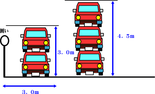 | @保管の高さ イ 囲いから保管場所の側に3m以内の部分:高さ3mまで ロ 囲いから保管場所の側に3mを超える部分:高さ4.5mまで ハ 格納するための施設(構造耐力上安全なものに限る。)に保管する場合:使用済自動車等の搬出入に当たり、落下による危害が生ずるおそれのない高さ A保管の上限 上記の高さを超えない限りにおいて保管することができる数量 |