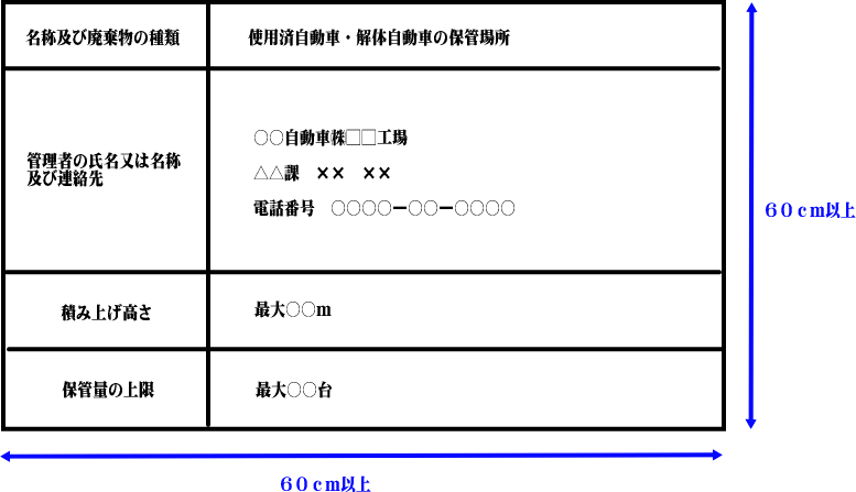 | 7 使用済自動車又は解体自動車の解体の方法、解体に伴って生じる廃棄物の処理の方法、部品・材料その他有用なものの保管の方法(産業廃棄物の保管場所の掲示板) |
