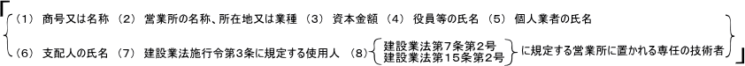 2 法第5条第2号に掲げる事項のうち営業所の新設に係る変更 当該営業所に係る法第6条第1項第4号及び第5号の書面 3 法第5条第3号に掲げる事項のうち役員等の新任に係る変更及び同条第4号に掲げる事項のうち支配人の新任に係る変更 当該役員等又は支配人に係る法第6条第1項第4号の書面及び第4条第3号又は第4号から第6号までに掲げる書面 |