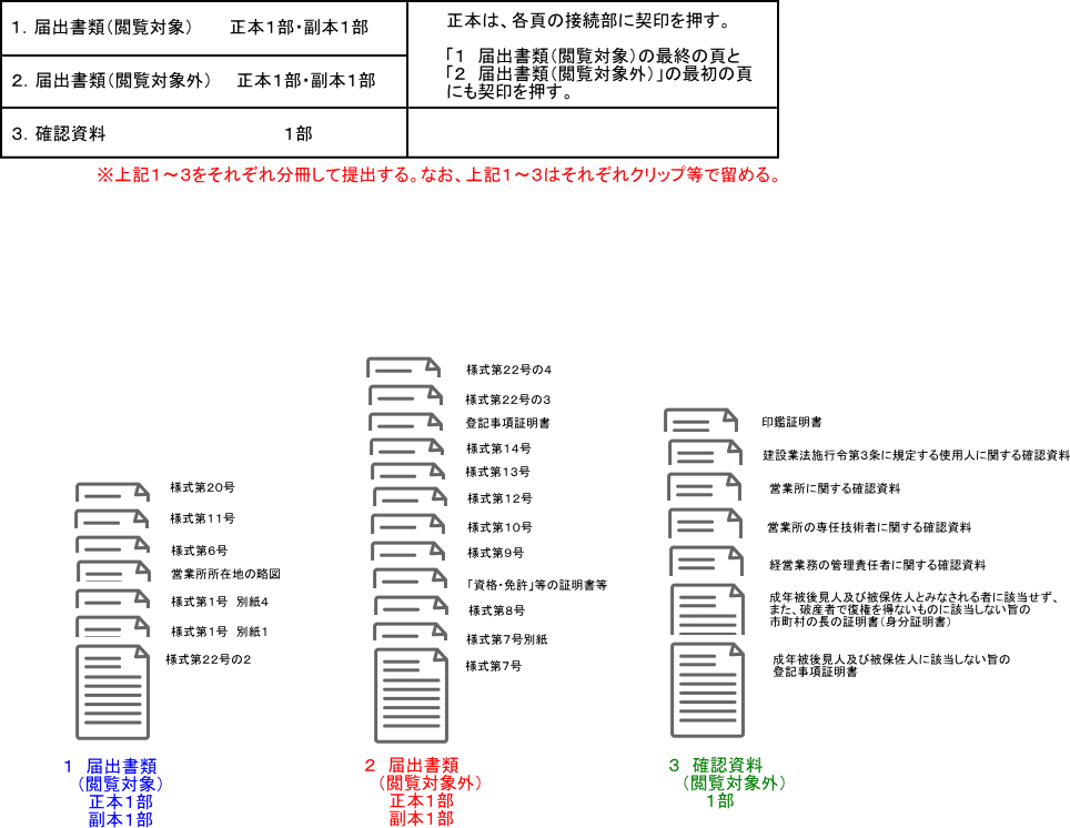 | (提出すべき書類の部数) 第2条 省令第7条第2号(省令第12条において準用する場合を含む。)に規定する知事の定める数は、次の各号に掲げる書類の区分に応じ、当該各号に定める数とする。 (1) …(略)… (2) 法第3条第3項の許可の更新を申請する場合において法第5条の規定により提出すべき許可申請書及びその添付書類並びに法第11条又は省令第7条の2若しくは第8条の規定により提出すべき届出書及びその添付書類 正本1通及び副本1通 (契印の押なつ) 第3条 法及び省令の規定により知事に提出すべき書類(次条において「書類」という。)で2枚以上にわたるものは、接続部に契印を押なつしなければならない。 (書類の提出) 第4条 書類は、主たる営業所の所在地を管轄する地方局へ提出しなければならない。 |
