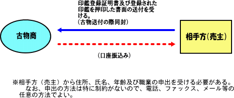 | (2) 相手方から、印鑑登録証明書及び登録された印鑑を押印した書面の送付を受けること(施行規則第15条第3項第1号)。 ア 本件措置は、相手方からいわゆる実印の印影を提出させ、当該実印の印鑑登録を受けた者であることを疎明させるものである(印鑑登録事務処理要領(昭和49年2月1日付け自治振第10号別添)参照)。 イ 「書面」には特に制約はなく、買取り申込書、査定申込書等のほか、印影以外の文字等が記載されていないものでもよい。 ウ 本件措置においては、併せて、相手方からその住所等の申出を受けなければならない。 |