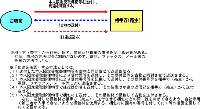 | (3) 相手方に対して、本人限定受取郵便物等を送付し、その到達を確かめること(施行規則第15条第3項第2号)。 ア 本件措置は、本人限定受取郵便物等が、名あて人等であることを証明するに足りる一定の書類を提示しなければ受け取ることができない取扱いをされることを利用して、相手方が名あて人本人であることを疎明させるものである。 イ 「名あて人本人若しくは差出人の指定した名あて人に代わつて受け取ることができる者に限り交付する取扱いをされる郵便物」とは、郵便規則(昭和22年逓信省令第34号)第120条の30の10に規定する本人限定受取郵便物をいう。 本年〔注:平成15年〕4月1日に日本郵政公社が発足し、郵便規則から本人限定受取郵便物に関する規定が削除されることとなるが、日本郵政公社の内国郵便約款により、同様の取扱いによる役務が提供される予定である。したがって、本年〔注:平成15年〕4月1日以降は、日本郵政公社により同様の取扱いがなされる郵便物がこれに該当することとなる。 ウ 「名あて人本人若しくは差出人を指定した名あて人に代わつて受け取ることができる者に限り交付する取扱いをされる」「信書便」については、民間事業者による信書の送達に関する法律(平成14年法律第99号)の施行(平成15年4月1日)後、一般信書便事業者(同法第2条第6項)又は特定信書便事業者(同条第9項)が当該取扱いによる信書便(同条第2項)の役務を提供することとなった場合は、当該役務による信書便物(同条第3項)が該当することとなる。 エ 「到達を確かめる」方法には、次のようなものが含まれる。 @ 送付した本人限定受取郵便物等を古物と同封させて返送させる方法 A 本人限定受取郵便物等により受付票等を送付し、当該受付票等を古物と同封させて返送させる方法 B 本人限定受取郵便物等に受付番号等を記載して送付し、当該受付番号等を相手方から電話、電子メール等により連絡させる方法 C 本人限定受取郵便物等で往復葉書を送付し、その返信部を相手方から送付させる方法 D 本人限定受取郵便物等で梱包材を送付し、その梱包材で梱包して古物を送付させる方法(古物商が送付した梱包材と相手方から送付を受けた古物の梱包材との同一性が判断できるように、自社専用で第三者が入手できない梱包材を使用する、梱包材に個別の番号を付しておくなどの措置が必要である。) オ 本件措置においては、併せて、相手方からその住所等の申出を受けなければならない。 |
