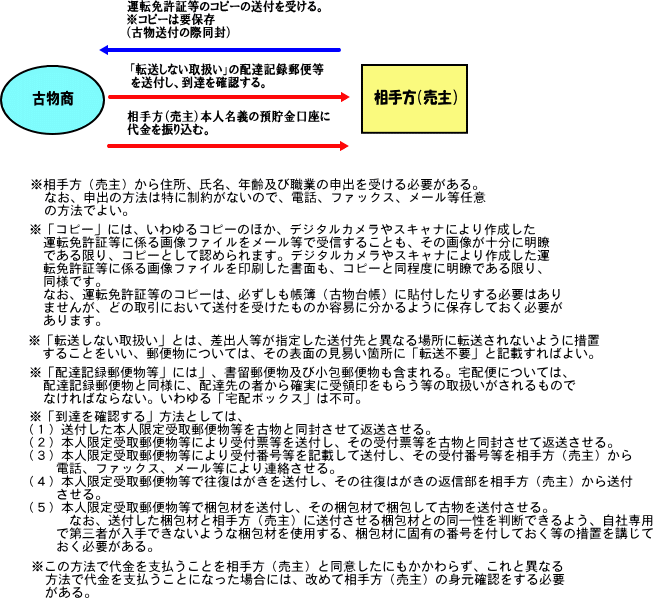 | 相手方からその住所、氏名、職業及び年齢の申出を受けるとともにその身分証明書、運転免許証、国民健康保険被保険者証等その者の身元を確かめるに足りる資料の写し(明瞭に表示されたものに限る。)の送付を受け、当該資料の写しに記載されたその者の住所に宛てて配達記録郵便物等で転送をしない取扱いをされるものを送付し、かつ、その到達を確かめ、並びに当該資料の写しに記載されたその者の氏名を名義人の氏名とする預貯金口座への振込み又は振替の方法により当該古物の代金を支払うことを約すること(当該古物に係る法第16条の帳簿等又は電磁的方法による記録とともに当該資料の写しを保存する場合に限る。) |
