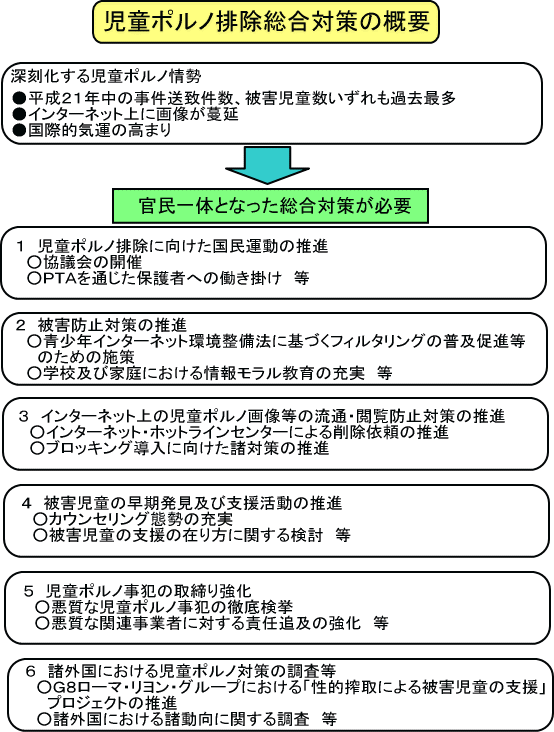 総合対策は、児童ポルノを排除するため、今後3年間を目途に、政府として早急に行うべき施策を取りまとめたものであり、