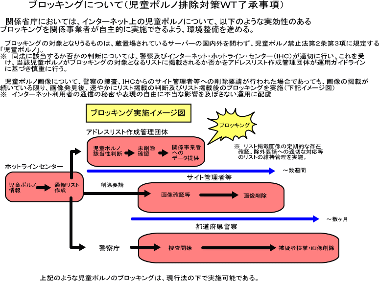 インターネット上の児童ポルノについては、児童の権利を著しく侵害するものであり、インターネット・ホットラインセンターが把握した画像について、サイト管理者等への削除要請や警察の捜査・被疑者検挙が行われた場合等でも、実際に画像が削除されるまでの間は画像が放置されるところであり、児童の権利を保護するためには、サーバーの国内外を問わず、画像発見後、速やかに児童ポルノ掲載アドレスを作成し、ISPによる閲覧防止措置(ブロッキング)を講ずる必要がある。そこで、このようなブロッキングについて、インターネット利用者の通信の秘密や表現の自由に不当な影響を及ぼさない運用に配慮しつつ、平成22年中を目途にISP等の関連事業者が自主的に実施することが可能となるよう、下記の対策を講ずる。(警察庁、総務省、内閣官房、内閣府、経済産業省)