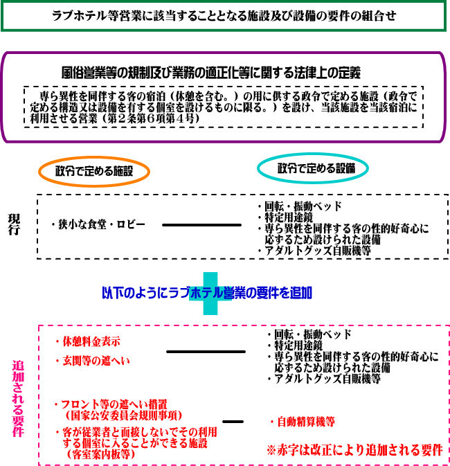 | ラブホテル等営業に該当することとなる施設及び設備の要件の組合せ(図解) |