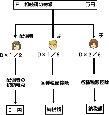 | ※配偶者が2分の1、子の1人が6分の1、もう1人の子が6分の2を相続する例 |