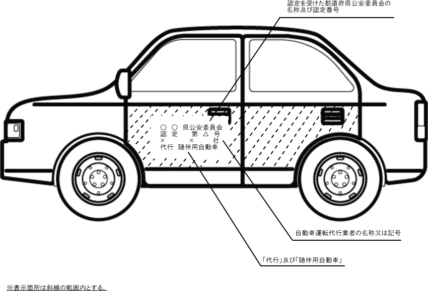 (1) 規則第7条第1項による場合にあっては、自動車運転代行業者の名称又は記号、認定を行った都道府県公安委員会の名称及び認定番号並びに「代行」及び「随伴用自動車」の表示は、ペンキ等による横書きとし、車体の両側面に行うこと。