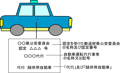 | 旅客自動車運送事業の用に供する自動車(タクシー)を随伴用自動車として用いる場合を除き、上記表示を両側面に「ペイント」で表示しなければならない。 |