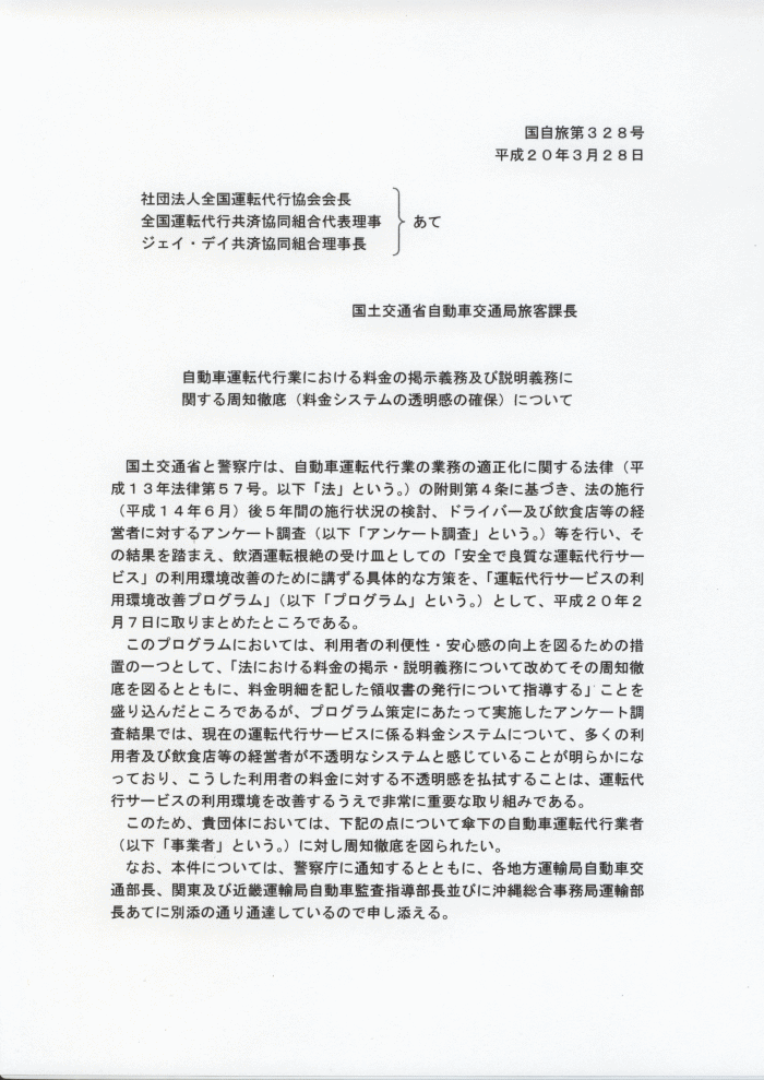 | 自動車運転代行業における料金の掲示義務及び説明義務に関する周知徹底等(料金システムの透明感の確保)について |