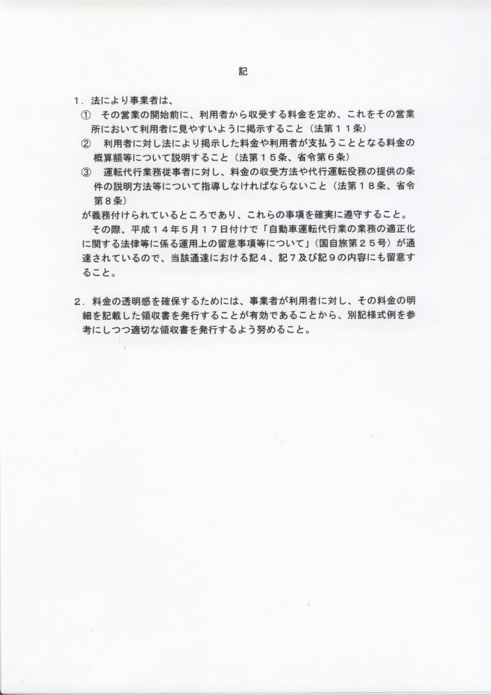 | 自動車運転代行業における料金の掲示義務及び説明義務に関する周知徹底等(料金システムの透明感の確保)について:記 |